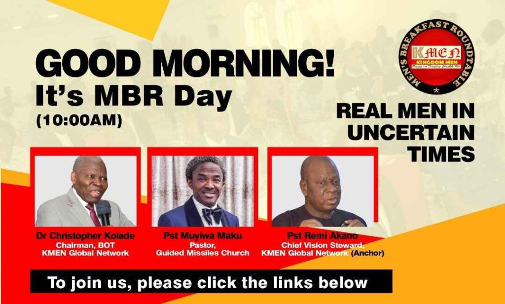 Men’s Breakfast Roundtable (MBR) is a regular gathering of men to rub minds on issues peculiar to men, receive inspiration from the Holy Spirit and break bread with one another. Organised by Kingdom Men Global Network, KMEN, it is both In-Person and Virtual.