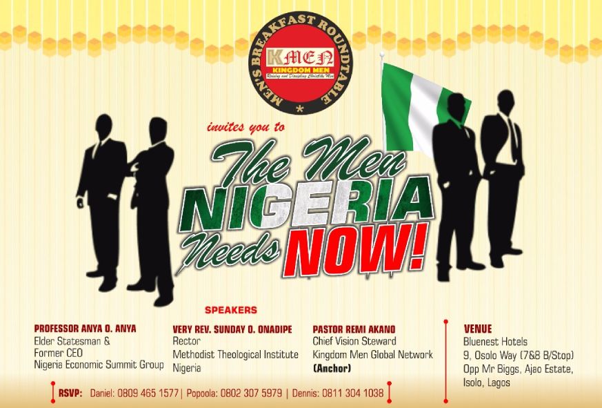 That is why the next edition of our regular gathering, MEN’S BREAKFAST ROUNDTABLE is themed, ‘THE MEN NIGERIA NEEDS NOW’. NOW, here refers to these testy times; these times of mindless hate speeches and declarations. Date is Saturday, July 8 at 8:30am -12:30pm and venue is Bluenest Hotels, 9, Osolo Way, Ajao Estate, Off Murtala Muhammed International Airport Road, Oshodi-Isolo.
